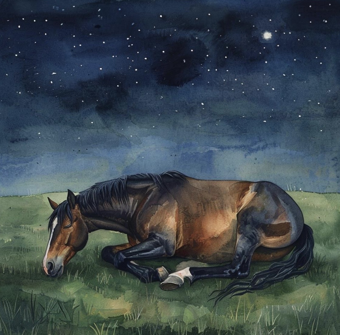 На самом деле это частое заблуждение. Многие наверно слышали, что лошади спят стоя, например, выражение «спать стоя, как лошадь». Лошади спят лёжа. Стоя они дремлют. Не стоит это путать. Лёжа они спят не всю ночь, а лишь от 2 до 4 часов. В этой позе лошадь спит и может видеть сны. Ложатся они только тогда, когда чувствуют себя в безопасности. Почему норма максимум до 4 часов? Потому что, если