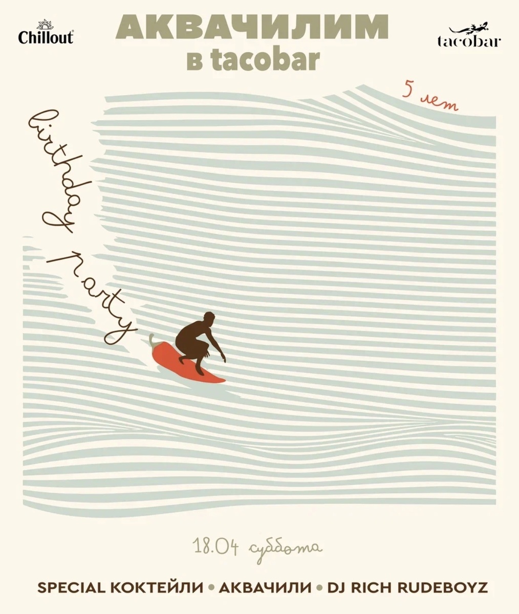 В субботу, 18 апреля, ресторан современной мексиканской кухни Tacobar распахнет свои двери, чтобы отпраздновать свой пятый день рождения. Приглашаем вас на грандиозную вечеринку «Аквачилим в Tacobar», где атмосфера курорта и тепла окутает вас с головой. Здесь лето на Пятницкой начинается не с первым летним месяцем, а с этим ярким праздником!