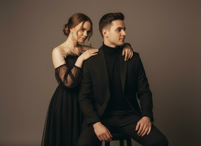 Do not change faces. Romantic couple studio portrait, medium shot, eye-level camera angle. A young handsome man and a beautiful woman in an intimate, elegant pose. The man is seated on a stool, body facing forward, head turned in profile to the right, looking at the woman. The woman stands behind him, leaning gently onto his shoulder, her arm draped over his shoulder, looking softly back. Clothing (Man): elegant all-black attire, a thick black turtleneck under a structured black tailored suit jacket and black trousers. Clothing (Woman): a black strapless evening dress with subtle feather details at the neckline, and gathered sheer black tulle sleeves covering her arm. Her hair styled in an elegant, relaxed low bun with soft wavy strands framing her face, and wears vintage drop earrings. Subject realism: natural asymmetry, fine natural skin pores, subsurface scattering, micro expressions, genuine intimate connection. Environment depth: plain, neutral warm-grey (taupe) studio backdrop, atmospheric density, soft separation from the background. Lighting engineering: physically accurate light, soft directional studio lighting from the right side, beautiful Rembrandt light on the man’s profile, smooth and deep shadow falloff on the left side of the frame, realistic highlights on the sheer tulle and hair. Camera system: Full Frame Canon EOS R5, 50mm lens, f/4.0, ISO 400, 1/125s shutter speed, natural depth of field keeping both faces in focus. Texture authenticity: matte wool fabric weave, transparency of the sheer tulle, subtle analogue film grain, natural unretouched skin texture. Color science: muted vintage color grading, warm earthy tones, deep matte blacks, true-to-life skin tones, realistic dynamic range, natural contrast curve.