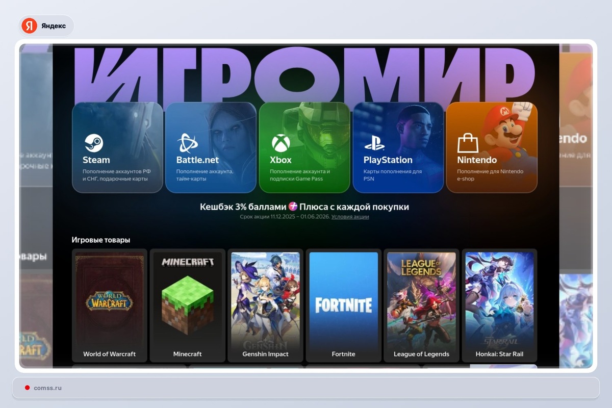 Яндекс запустил сервис «Игромир» – облачный гейминг и магазин цифровых товаров #Яндекс #Игромир #игры Новый сервис «Игромир» от «Яндекса» объединил облачный гейминг и магазин цифровых игровых товаров. Платформа позволяет запускать более 150 игр из библиотек Steam, Epic Games и «Леста Игры» через браузер с почасовой оплатой, а также пополнять игровые аккаунты и покупать внутриигровую валюту https://www.comss.ru/page.php?id=20264