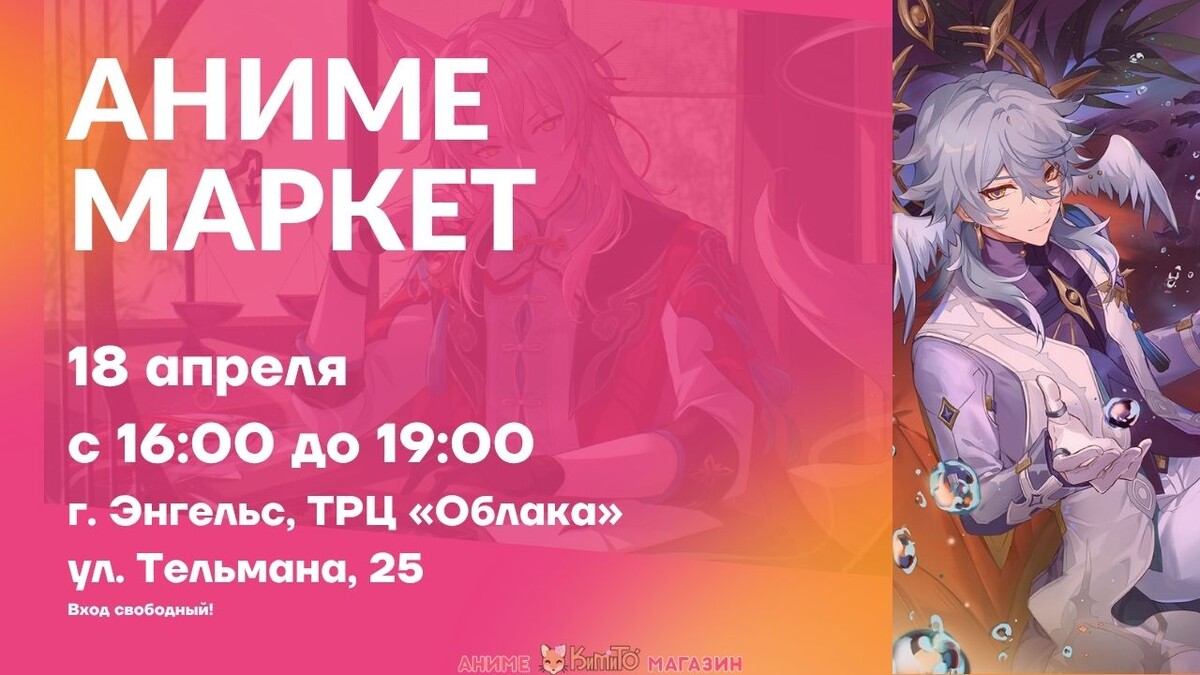 🤩🤩🤩🤩🤩 🤩🤩🤩🤩🤩🤩🤩🤩 ЭНГЕЛЬС, АНИМЕ ЯРМАРКА! Друзья, мы знаем, как вы этого ждали! 🌟Крутые фигурки уже собраны, яркие плакаты и значки ждут своего часа, азиатские сладости упакованы, а топовую мангу и комиксы мы уже загрузили. Будет море мерча по твоим любимым фендомам: аниме, Genshin Impact, k-pop и сериалы🌟 Уже совсем скоро ты сможешь увидеть всё это вживую. Приходи сам и зови друзей, будем ждать! Когда: 18 апреля (суббота) Время: с 16:00 до 19:00 Где: г. Энгельс, ТРЦ «Облака» ( ул. Тельмана, 25) Вход свободный!