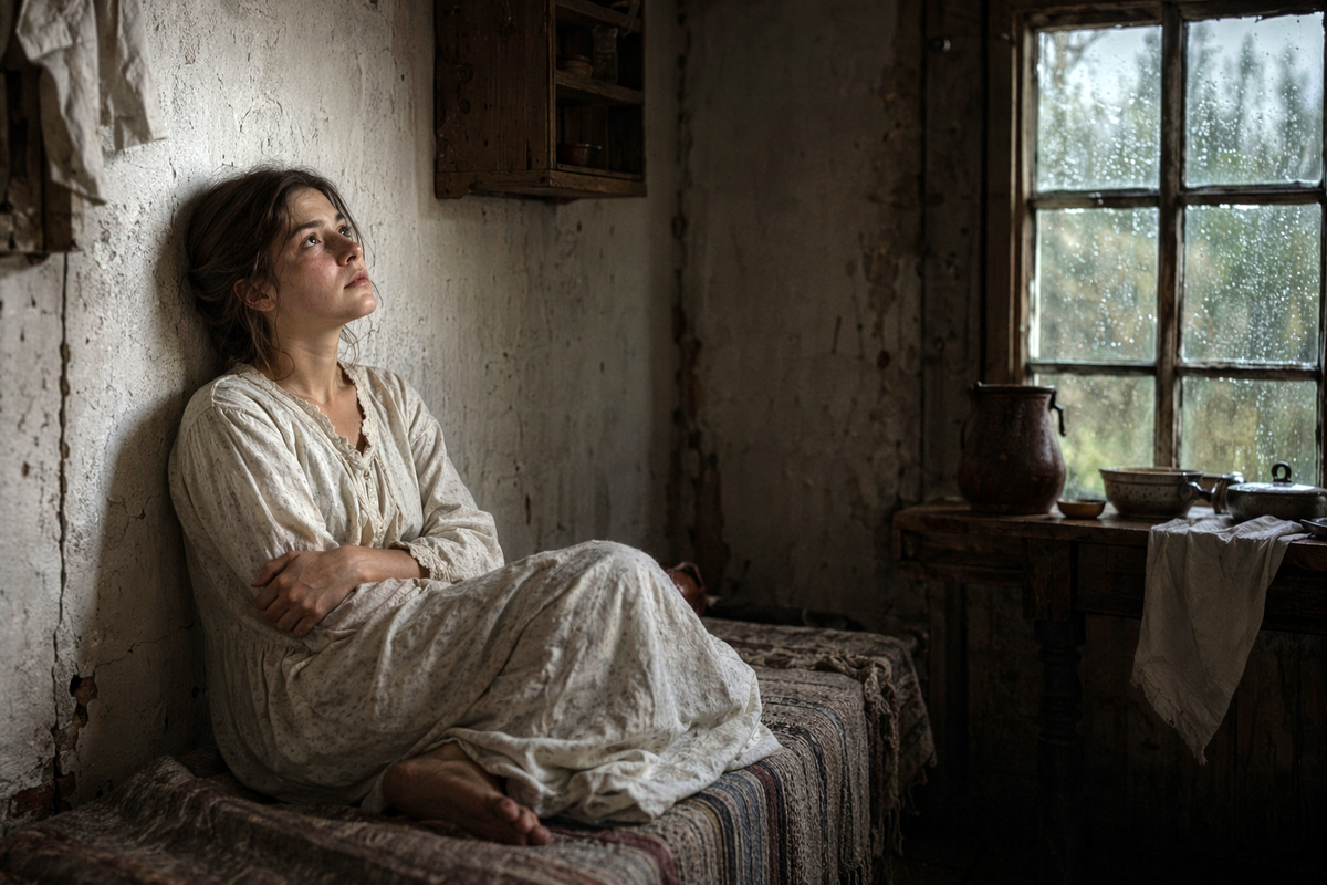 Спросить было не у кого. Только тёмный потолок, шорох мышей за печью и редкие капли дождя по стеклу. Горничная повернулась на бок, поджала колени ещё крепче, обхватила себя руками за плечи – так теплее, будто кто-то обнимает, – и закрыла глаза. Сон не шёл, но она лежала тихо, не шевелясь, слушая, как бьётся сердце и как где-то далеко лает собака.