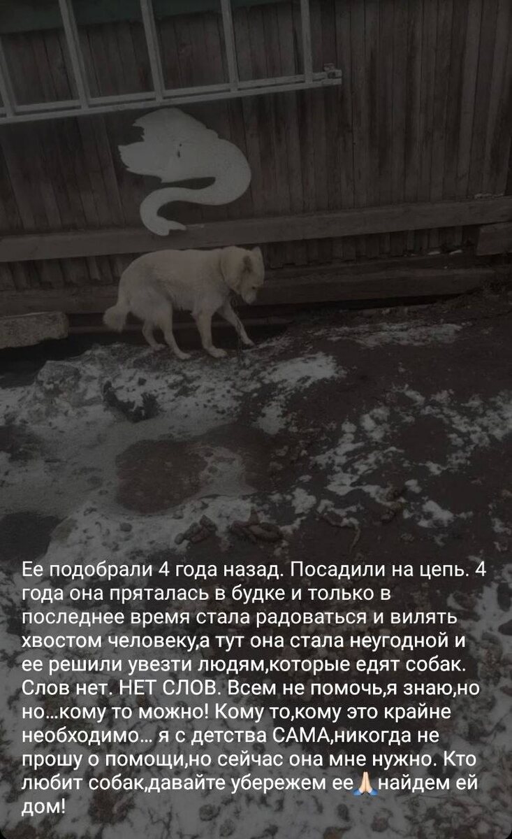 ?! ✉️ Ее подобрали 4 года назад. Посадили на цепь. 4 года она пряталась в будке и только в последнее время стала радоваться и вилять хвостом человеку,а тут она стала неугодной и ‼️ ее решили увезти людям,которые едят собак ‼️. Слов нет. НЕТ СЛОВ. Всем не помочь,я знаю,но но...кому то можно! Кому то,кому это крайне необходимо... я с детства САМА, никогда не прошу о помощи,но сейчас она мне нужно. Кто любит собак,давайте убережем ее / найдем ей дом 🙏 📞 8 (923) 604-37-77 📞 8 (923) 490-00-60