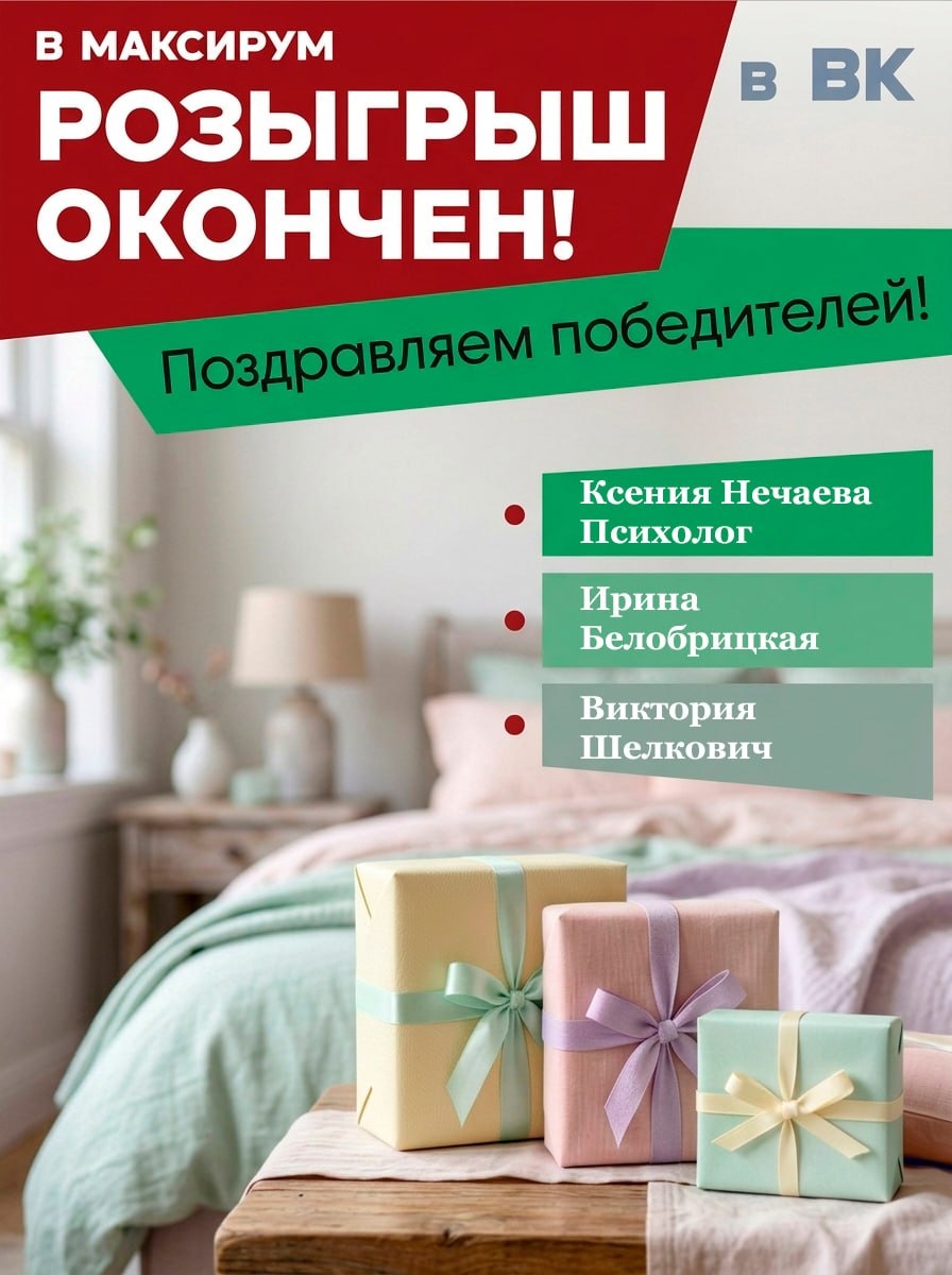 ! 🎁1 место и 2 подушки Premium Dream: Ксения Нечаева Психолог 🎁2 место и комплект постельного белья "Семейный": Ирина Белобрицкая 🎁3 место и подушка Notte Saponetta: Виктория Шелкович Мы находимся по адресу: г.Керчь, ул. Маршала Ерёменко, 7Ф - приходите или пишите в сообщения группы 😊 Победители определены независимым сайтом konkurzilla.ru Постоянная ссылка на результаты розыгрыша konkurzilla.ru/pobediteli...