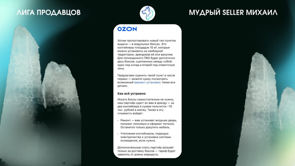 ‼️ Ozon начал предлагать модульные боксы площадью 15 м² для размещения пунктов выдачи. Два контейнера — один для обслуживания клиентов, второй под хранение товаров — и точка готова к работе. Как сообщает Оборот.ру, пока проект запущен в небольших населённых пунктах Московской области, но география планируется к расширению. 💴 Аренда двух боксов обойдётся партнёру примерно в 15 тысяч рублей в месяц. В эту сумму входят ремонт, утепление, подводка электричества и даже система охлаждения по желанию. Доставку контейнеров до места Ozon тоже берёт на себя, но уже за отдельную плату в зависимости от расстояния. Мебель партнёр закупает самостоятельно. 💳 Работать можно по одному из двух тарифов. «Максимум бренда» даёт 5–6% от стоимости заказа (в первые три месяца — 10%) и поддержку до 2,8 млн рублей за девять месяцев. «Домашний» тариф рассчитан на сёла и деревни — 5% от заказа. В обоих случаях потолок выплаты составляет 250 рублей за одну выдачу. 🔔 15 тысяч в месяц за два бокса — это ниже р