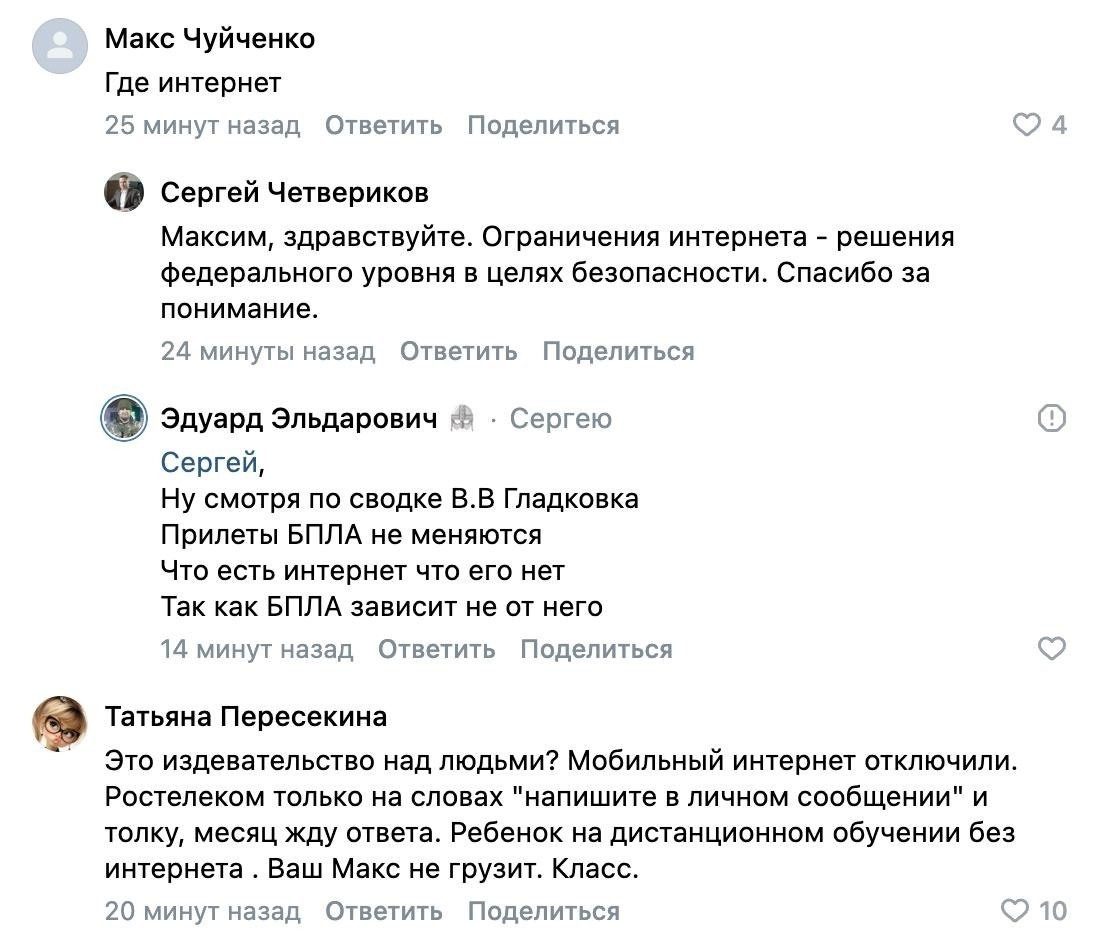 Массовые обращения и жалобы белгородцев на сегодняшнее отключение мобильного интернета