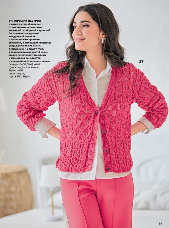 Добрый день, Дорогие рукодельницы! Сегодня мы продолжим листать журнал Сабрина апрель 2026. Тут мне понравилось почти всё. Правда цвет не мой, я люблю более нейтральные цвета, или зеленый) Больше всего мне понравился кардиган под номером 32. А вам понравилось что-то в этой части журнала? Журнал Сабрина первая часть журнала Моя группа в ВКонтакте , где исключительно мои работы. Буду очень благодарна, если вы подпишитесь на все мои соц сети: Вконтакте ссылка Телеграмм ссылка Одноклассники ссылка Ютуб ссылка Второй дзен канал ссылка Рутуб ссылка Мах ссылка Ещё подборки с журналами: Кардиган с сочетанием ажурных узоров. Пряжа: 100% хлопка; 135м/50г. Спицы: 3,5 и 4м.. Пуловер с перекрещенной резинкой. Пряжа: 95% хлопка, 5% полиамида; 330м/50г. Спицы: 3,5 и 4,5 мм. Связанный поперек пуловер. Пряжа: 53% шерсти, 47% хлопка; 195м/50г. Спицы: 3 и 3,5мм. Пуловер с ажурными ромбами. Пряжа: 100% хлопка; 130м/50г. Спицы: 5 мм. Жилет оверсайз на пуговицах с боковыми разрезами. Пряжа: 60% шерсти, 40%
