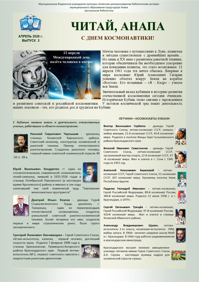 Новый праздничный выпуск библиогазеты «Читай, Анапа!» От земных истоков — к звёздным высотам!
