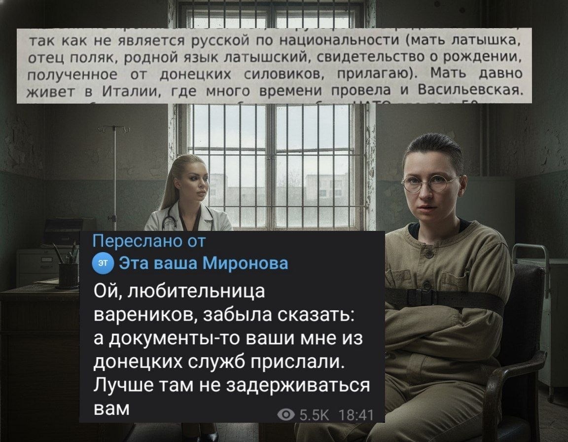 Миронова!!! 😁 Завтра я задам вопрос компетентным органам, чтобы те установили личности тех самых донецких силовиков, передавших тебе мои