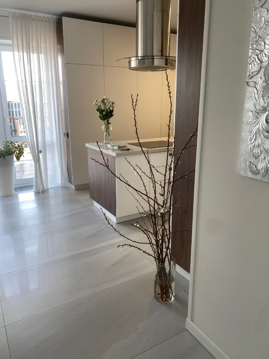 Как всегда, у неё блеск и чистота, и готовилась она тогда к Пасхе, но ещё не украсила, только вот такие ветки абрикосов стоят в вазах и набирают цвет.