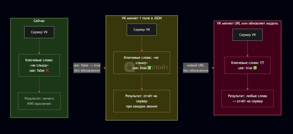 Еодер разобрал клиент и обнаружил встроенный механизм KWS (Keyword Spotting), нейросеть, которая может анализировать аудио прямо во время разговора.