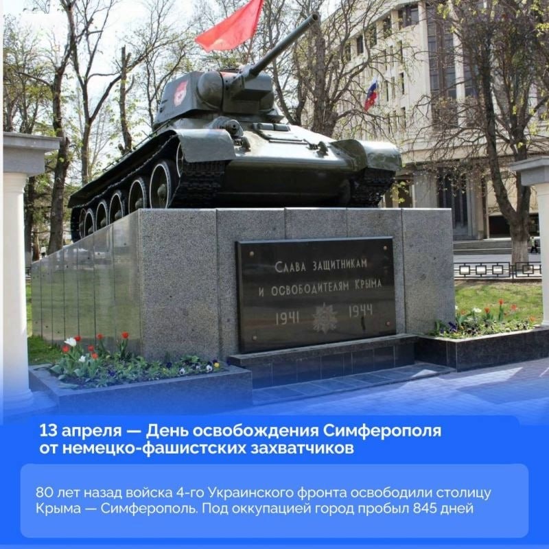 ) 13 апреля 1944 года войска 4‑го Украинского фронта освободили столицу Крымской АССР город Симферополь от немецко‑фашистской оккупации, продолжавшейся 865 дней. Освобождение Крыма стало возможным в ходе Крымской наступательной операции. 8 апреля 1944 года войска 4‑го Украинского фронта под командованием генерала армии Фёдора Толбухина при поддержке Черноморского флота, Азовской военной флотилии и крымских партизан начали решительное наступление против 17‑й немецкой армии, блокированной на полуострове. В ночь на 13 апреля группы партизан Северного соединения проникли в Симферополь и атаковали казармы немецкого гарнизона. Утром в город ворвались танки 79‑й танковой бригады полковника Петра Архипова и 101‑й танковой бригады подполковника Михаила Хромченко. Следом в город вошли части 27‑й мотострелковой и 6‑й гвардейской танковой бригад, которые окончательно выбили противника с улиц города. Вместе с советскими войсками в Симферополь вошли и партизаны 1‑й бригады под командованием Фёдо
