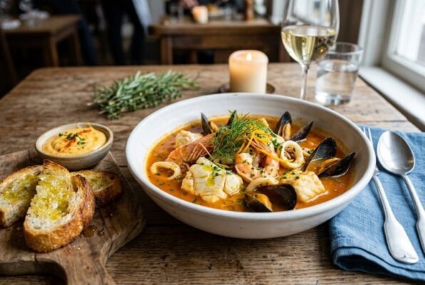 Французские рыбаки когда‑то варили похлёбку из того, что оставалось от непроданной рыбы. Сегодня буйабес классический рецепт превратился в кулинарную легенду: ароматный, насыщенный, с шафраном и острым соусом.