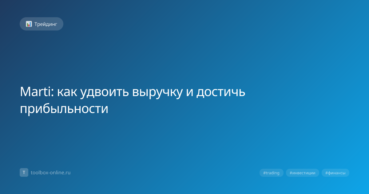 Выручка Marti удвоилась до 2,4 млрд ₽ в 2026 году, а компания уже нацелена на достижение прибыльности выше 15 % к концу года. Это стало возможным благодаря сочетанию масштабных маркетинговых кампаний и технологических новшеств, которые позволили увеличить средний чек клиента до 12 %. Удвоение выручки стало результатом расширения клиентской базы и внедрения новых алгоритмических стратегий в торговлю. За первые шесть месяцев 2026 года количество активных пользователей выросло с 45 000 до 92 000, а средний объём сделок увеличился на 27 %. Прибыльность выросла благодаря оптимизации расходов и повышению маржи на ключевых продуктах. Сокращение операционных затрат на 14 % и автоматизация процессов привели к увеличению чистой прибыли до 360 млн ₽, что составляет 15 % от общей выручки. Следуйте проверенному плану из пяти шагов, адаптировав его под свои условия. Применяя эти рекомендации, вы сможете увеличить выручку и приблизиться к целевой прибыльности. Инструменты Toolbox‑online позволяют быс