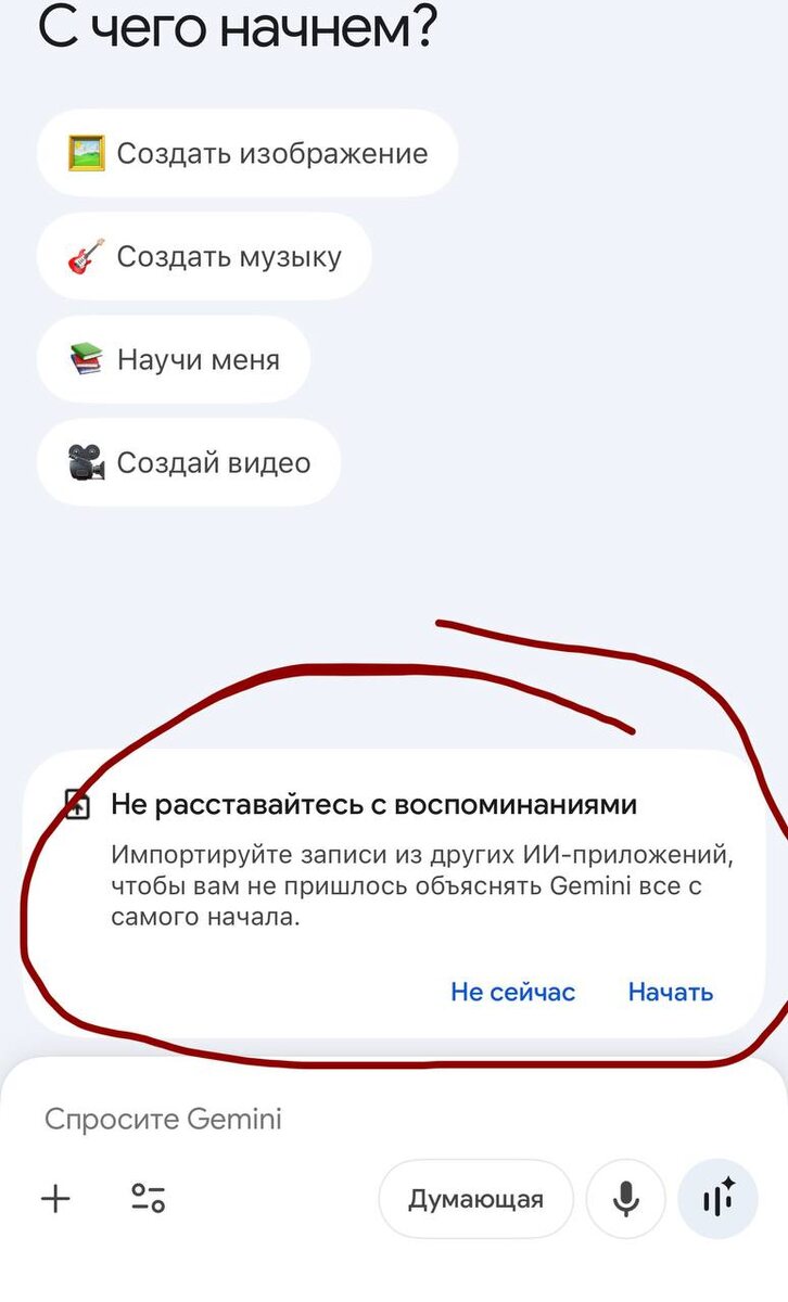 ! Кто активно использует Gemini - они добавили новую фи-ше-чку! Теперь (как и в Claude) есть новая функция импорта воспоминаний и истории чатов из других ИИ (например, ChatGPT или Claude). Если коротко: теперь ему не нужно заново объяснять, кто вы, как вы любите работать и над какими проектами корпите в других сервисах. Очень удобно! Я уже перенесла из Гпт 🙌🏻