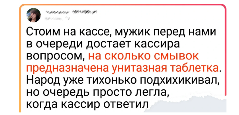 Стоим на кассе, мужик перед нами в очереди достает кассира вопросом, на сколько смывок предназначена унитазная таблетка. Народ уже тихонько подхихикивал, но очередь просто легла, когда кассир ответил: «Если у вас стул нормальный, то на месяц, а вот если диарея — извините, это уже форс-мажор, — всего на 3 дня». © Olga Vlas
