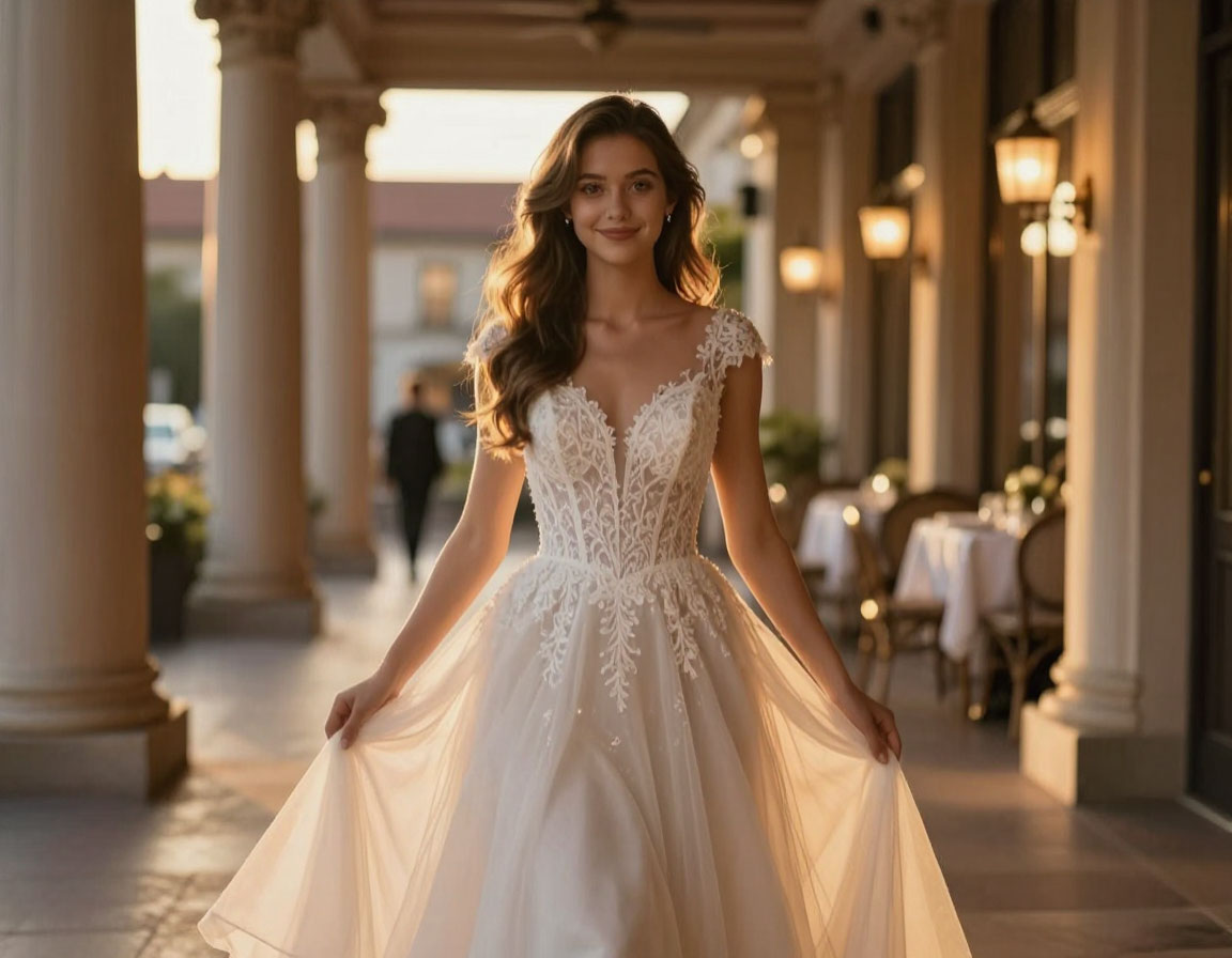 Платье с ручной вышивкой сидело идеально, подчёркивая тонкую талию и изящные плечи. Лёгкие складки ткани струились до самого пола, переливаясь в свете ламп. Волосы уложены мягкими волнами карамельного оттенка, лёгкий макияж делал глаза ещё более выразительными, а губы чуть ярче – но всё равно естественно. Лиза коснулась рукой шеи, где билась жилка – так сильно она волновалась. Руки слегка дрожали, но она старалась это скрыть.