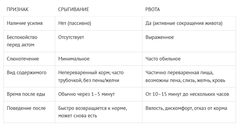 Для владельца крайне важно уметь отличать рвоту от срыгивания (регургитации), поскольку эти состояния имеют разную этиологию, прогноз и тактику ведения пациента.