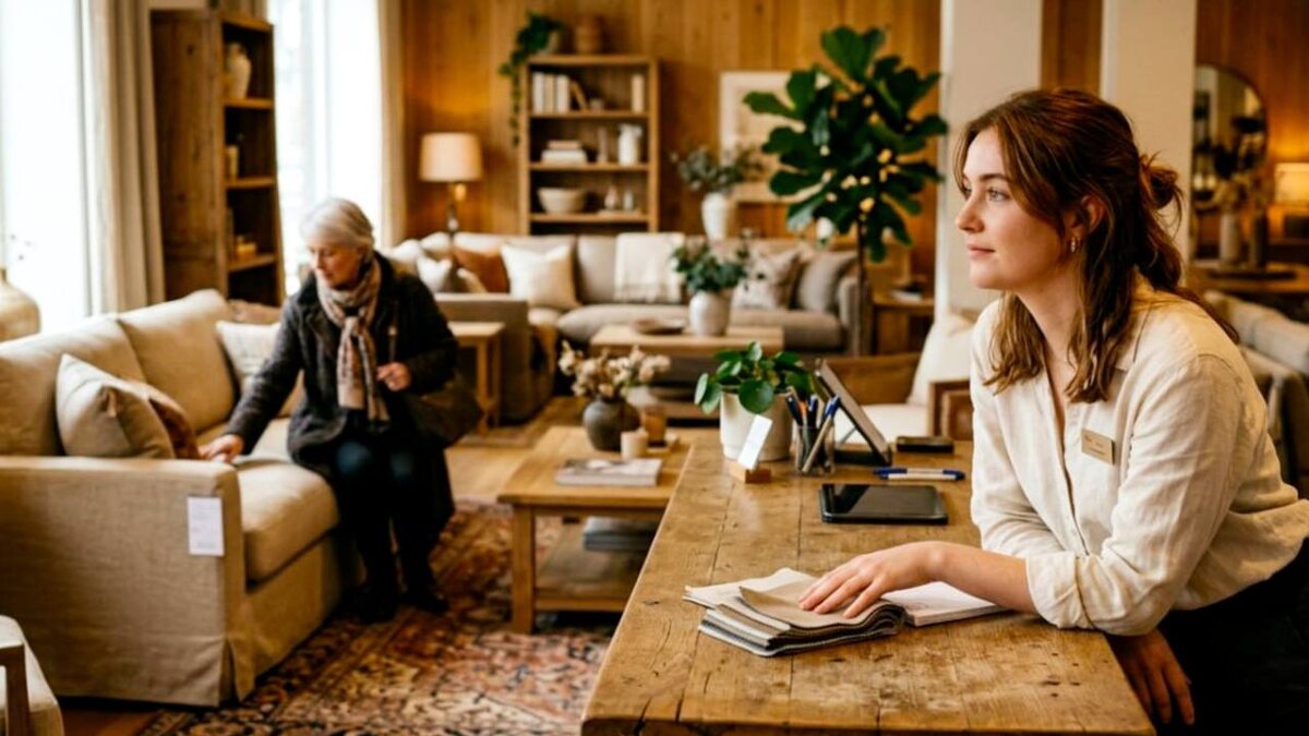 Оля работала в мебельном. Не сетевой гигант на три этажа, а обычный магазин среднего размера — диваны, стеллажи, светильники, всё для дома. Хороший ассортимент, приличные цены, обычный поток: молодые семьи с детьми, пенсионеры с рулетками, командировочные, которые ищут кресло в офис.