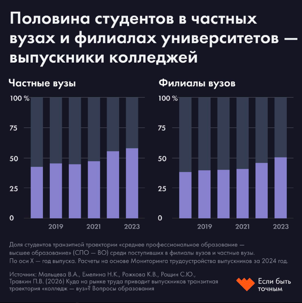 Российская политика в сфере образования считает успехом системы СПО прямой выход выпускников на рынок труда. Но около трети из них идут дальше — в университет. Это устойчивая стратегия, показывают исследователи из НИУ ВШЭ. Большинство «транзитников» оказываются в особой нише высшего образования — это заочные программы, платные места, филиалы и частные университеты с низким конкурсом. К 2023 году выпускники колледжей составляют половину студентов таких вузов. Переход из колледжа в вуз окупается. Но путь к высшему образованию определяет рыночную цену выпускника не меньше, чем сам факт его наличия. 🔸По сравнению с теми, кто остановился после колледжа, транзитники выигрывают: разрыв в зарплате начинается с 13% и вырастает до 18% спустя несколько лет. 🔸По сравнению с теми, кто пришел в университет напрямую из школы, — проигрывают: поначалу разрыв едва заметен, но со временем достигает 25% и продолжает расти. 🔸 В случае окончивших неселективный университет — с низким средним баллом ЕГЭ по