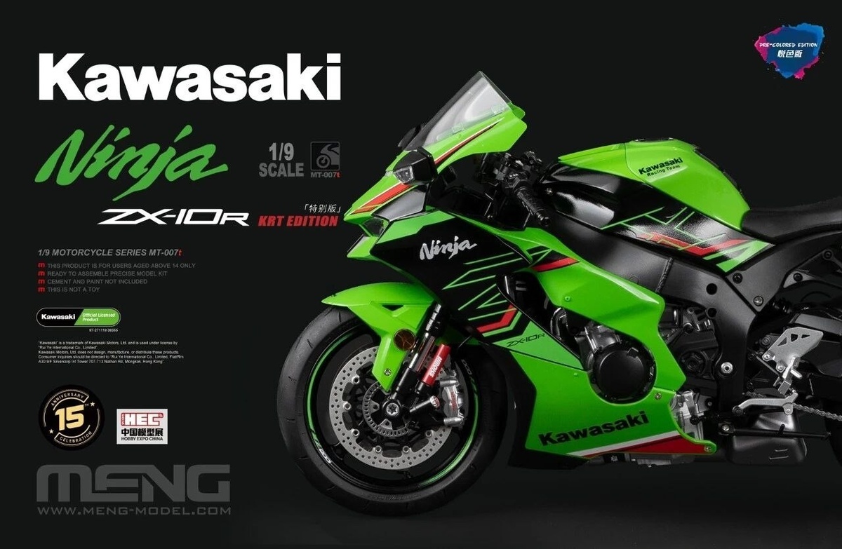 вариант своей модели разработки 2025 года Kawasaki Ninja в масштабе 1/9. Детали модели предварительно окрашены и могут собраны без клея: Kawasaki Ninja ZX-10R KRT Special Edition (Yui color edition) - каталожный номер MT-007t