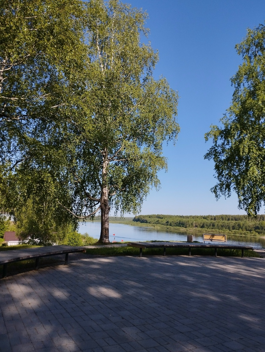 На фотографии запечатлён живописный уголок природы у реки Сухоны в начале лета. На переднем плане — мощёная площадка, залитая солнечным светом, с длинными деревянными скамейками, расположенными полукругом. Скамейки приглашают присесть и насладиться видом. Слева и справа в кадр попадают ветви берёз с ярко-зелёной листвой, которые создают лёгкую тень и добавляют композиции уюта. Центральное место занимает высокая берёза с тонким стволом и раскидистой кроной — она словно сторожит этот уголок природы. За деревьями простирается спокойна