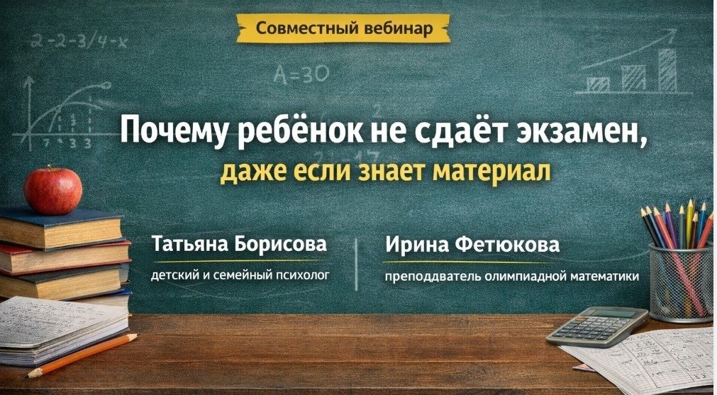 »? Очень часто дети не сдают не потому, что не знают, а потому что мешают страх, тревога и давление. 📌 17 апреля в 16:00 проведём совместный эфир с Ириной Фетюковой — преподавателем углублённой и олимпиадной математики Тема: «Почему ребёнок не сдаёт экзамен, даже если знает материал» На эфире разберём: — почему знания «пропадают» в стрессовой ситуации — какие психологические факторы мешают показать результат — на что важно обратить внимание родителям при подготовке — как объединить подготовку и психологическую готовность Этот эфир особенно важен, если: ✔ ребёнок переживает перед экзаменами ✔ вы видите, что он «может лучше, но не показывает» ✔ есть страх не поступить в сильную школу 📩 Запись в ЛС Можно написать «ЭКЗАМЕН» — вышлю подробности Приглашаем всех родителей 🙌