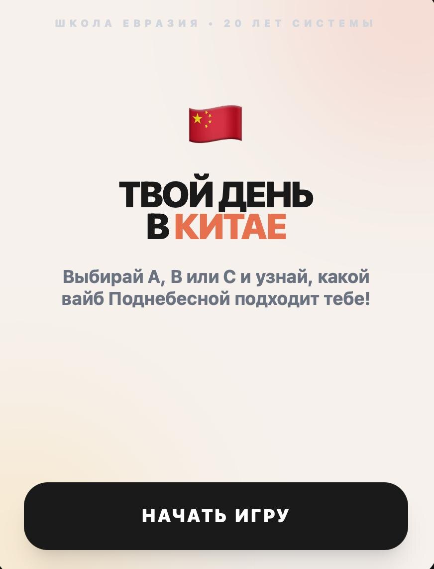 Куда пойдешь? Что попробуешь на вкус? Какой вайб выберешь для вечера? Мы сделали для тебя интерактивный тест-квест. Проходи его прямо в карточках, считай, каких букв у тебя больше — А, B или C — и смотри расшифровку на финальном экране! 🕹 КАК ИГРАТЬ: – Открывай карточки в превью. – Выбирай один из трех вариантов на каждом – Пиши в комментарии, какая буква выпадала чаще всего или какой титул ты получил(а)! Погнали строить свой идеальный день в Поднебесной! 👇