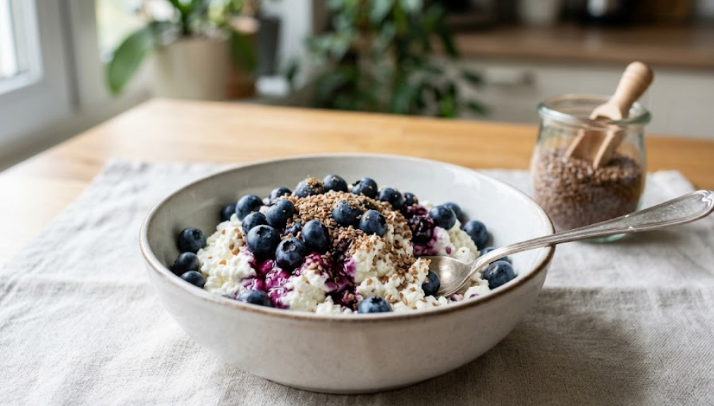 - Добавьте голубику. Если используете замороженную, добавьте её вместе с выделившимся соком — он окрасит творог и сделает вкус насыщеннее.
