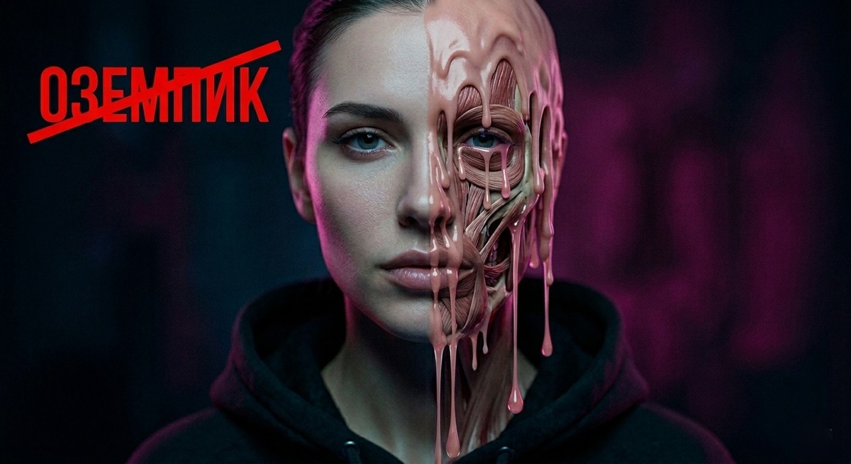 • «Оземпиковое лицо» (Ozempic Face): Резкая потеря жировых пакетов уничтожает коллагеновый каркас. Лицо «стекает», кожа провисает, а человек визуально стареет на 10 лет.