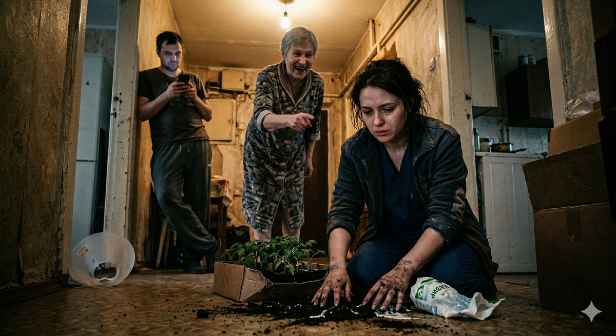 — Не видела она! — Свекровь подошла ближе, вытирая руки о кухонное полотенце. — А глаза тебе на что? Мы это полгода растили, на подоконниках места не было, Рома спину гнул, землю возил!