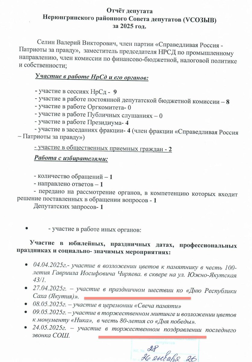 Отчет депутата: танцевал, праздновал, митинговал, возлагал цветы… Посмотрели отчет депутата – зампредседателя Нерюнгринского районного совета депутатов Селина Валерия за 2025 год, то есть какие предложения он сделал, в том числе по принятию или изменению правовых актов, учитывая, что Селин курирует промышленную политику, как взаимодействовал с районной администрацией, сколько встреч провел с избирателями, как реализовал их наказы… Но судя по отчету Селина основные его потуги были сосредоточены на участии в юбилейных и праздничных мероприятиях, именно этим мероприятиям посвящена большая часть его отчета. Себе в заслугу депутат Селин поставил участие в круговом танце «Осуохай» (то есть депутат танцевал), празднование Ысыаха, участие в различных торжественных совещаниях и митингах, например в честь Дня знаний или последнего звонка и т.д. О том, что сделал Селин, как заместитель председателя НРСД по промышленному направлению, член комиссии по финансово-бюджетной, налоговой политике и