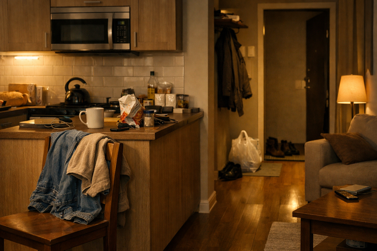 Дом редко “разваливается” резко. Обычно он медленно зарастает мелкими незавершенностями. На кухне сначала просто остается пара вещей на столешнице. Потом добавляются упаковка, кружка, аптечка, зарядка, список покупок, что-то “на потом”. В прихожей сначала стоит один пакет. Потом рядом появляются обувь, куртка, сумка, чек, коробка. В спальне стул перестает быть стулом и становится временным складом одежды.