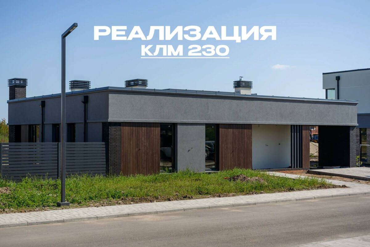КЛМ 230 🏠 Четкая геометрия, плоская кровля и контраст фактур штукатурки и дерева. Мы объединили природу и интерьер: панорамные окна в пол заливают дом светом, сохраняя вашу приватность, а стильное фартучное окно на кухне добавляет уюта рабочей зоне. Терраса встроена в объем дома — это не пристройка, а полноценное жилое пространство. 🏠 А атмосферный камин на террасе станет любимым местом вашей семьи. ❤️🔥