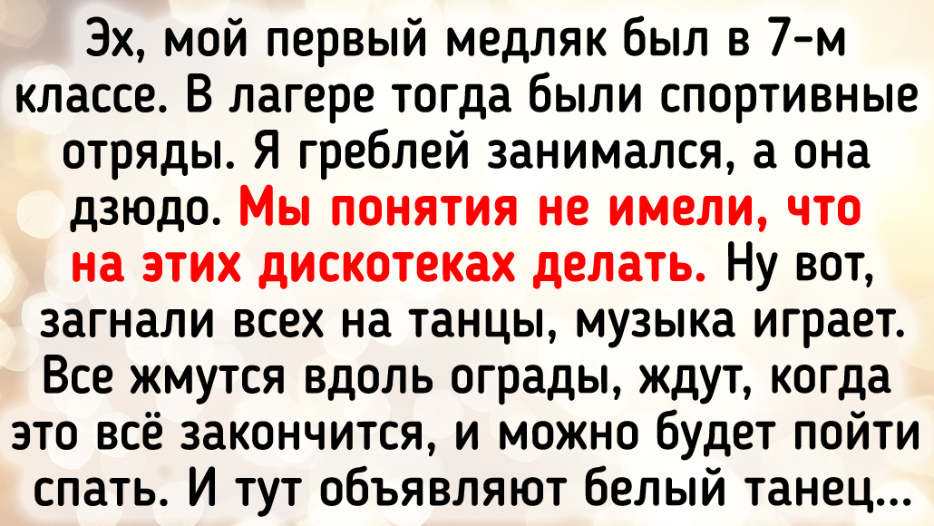 Эх, мой первый медляк был в 7-м классе. В лагере тогда были спортивные отряды. Я греблей занимался, а она дзюдо. Мы понятия не имели, что на этих дискотеках делать. Ну вот, загнали всех на танцы, музыка играет. Все жмутся вдоль ограды, ждут, когда это всё закончится, и можно будет пойти спать. И тут объявляют белый танец. Девочка уверенно идет к нам, берет мою ладонь и тянет меня в центр площадки. В общем, потоптались мы. И это было потрясающе! Мы так в обнимку все мелодии, даже быстрые, протоптались. На танцы это никак не походило. Но было все равно. © Kirsh12 / Pikabu