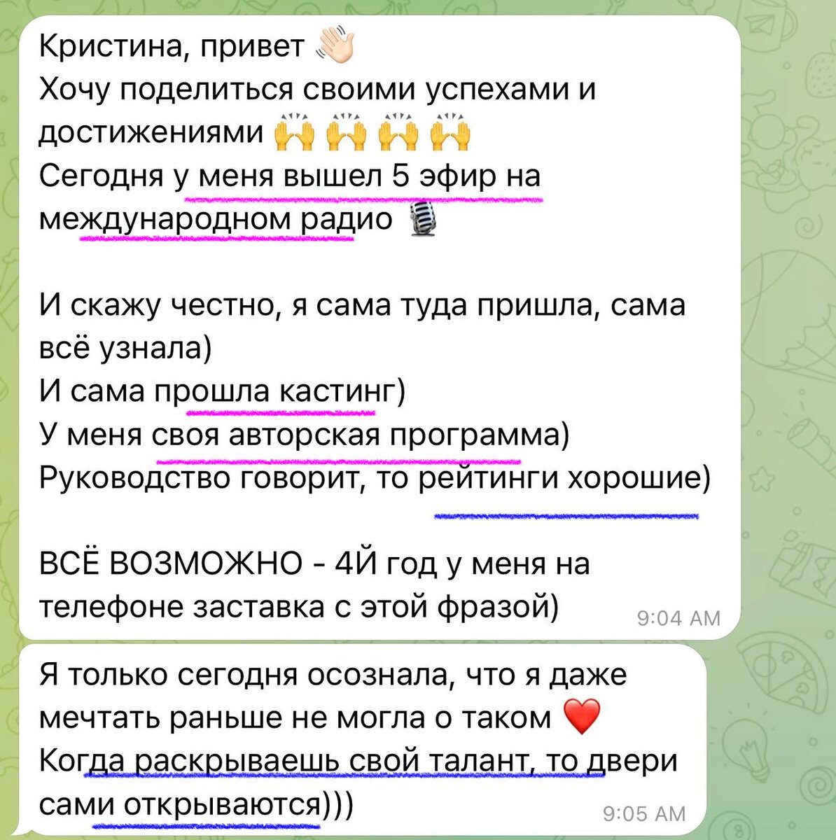 Возить Чеко на груминг, сажать цветочки в саду, ездить на пилатес… Возможность есть🤌🏻А потом получаю от вас такие сообщения —и понимаю, какую ценность на самом деле приносит моя работа. Женя — мой клиент, эксперт по коммуникациям и публичным выступлениям.Кстати, тоже из Пензы, как и я ☺️Раньше: детская театральная студия и несколько учеников по речи.Неплохо, но масштаб… сами понимаете. После нашей работы: • 2022 — купила свою квартиру • 2024 — переехала в Москву, в планах открытие студии • 2025 — стала ведущей на международном радио и поставила спектакль на сцене Московского театра Никакой магии. Просто точная настройка стратегии с учётом потенциала.Кстати, на одном из фото — Женя с другой моей клиенткой. Зульфия — соло-мама двух прекрасных девочек.Из специалиста МЧС → в востребованного кондитера и финалиста шоу «Король десертов» 🎂Переезд в Москву, квартира, своя студия, плюс консультации по социальному предпринимательству.И как перестать делать то, что любишь,когда видишь такие рез