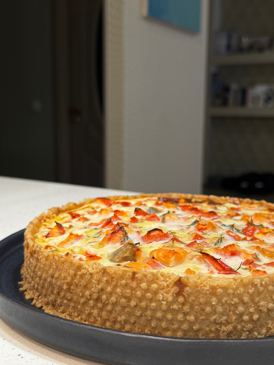 Нежный французский пирог с рассыпчатым песочным тестом, сочной начинкой из красной рыбы и кремовой заливкой — идеальный вариант для семейного обеда или праздничного стола.