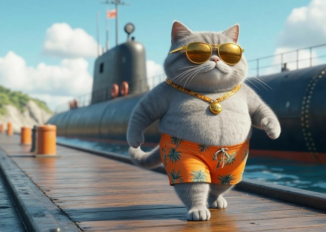 Мася был пушистый, толстый серый кот с важным видом и мягкой походкой, будто весь Владивосток построили специально для его прогулки. На нём красовались гавайские шорты с пальмами, а на мордочке сидели золотые солнечные очки — такие, что даже чайки на набережной уважительно притихали 😎🐾 Он шёл по Корабельной набережной, прислушиваясь к крикам портовых кранов и дальнему гулу моря. Ветер пытался утащить его настроение в сторону сопок, но Мася держал курс уверенно: впереди стояла С-56 — музей Тихоокеанского флота, подводная лодка-легенда. — Ну что, железная рыбина, — пробормотал он, — покажешь свои секретики? 🐟 Внутри было тесно, пахло металлом и историей. Мася протискивался по узким проходам, цепляя шортами поручни, и с любопытством заглядывал в отсеки. Таблички рассказывали про боевые походы, торпеды и команды, а он представлял, как здесь когда-то звучали команды: «К погружению!» Мася даже нашёл перископ — посмотрел в него и увидел… собственные усы. — Красота, — удовлетворённо хмыкнул