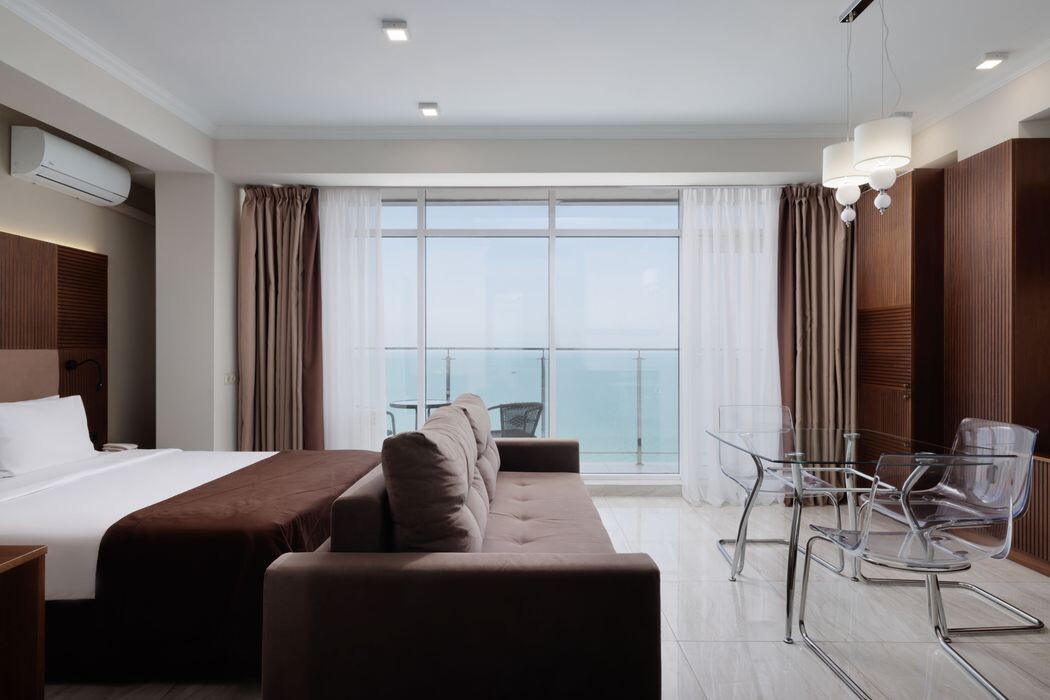 Отель «Престиж» в Адлере предлагает идеальное сочетание комфортного отдыха и бизнес-удобств. Просторные двухкомнатные номера категории «Люкс», площадью 46 м², созданы для тех, кто ценит как уют, так и возможность вести дела даже на отдыхе. В номере расположены спальня с французской кроватью и уютная гостиная с диваном-кроватью, а также балкон, с которого открывается великолепный вид на Черное море. Удобства включают кондиционер, беспроводной интернет и даже кухонное оборудование для приготовления легких закусок.