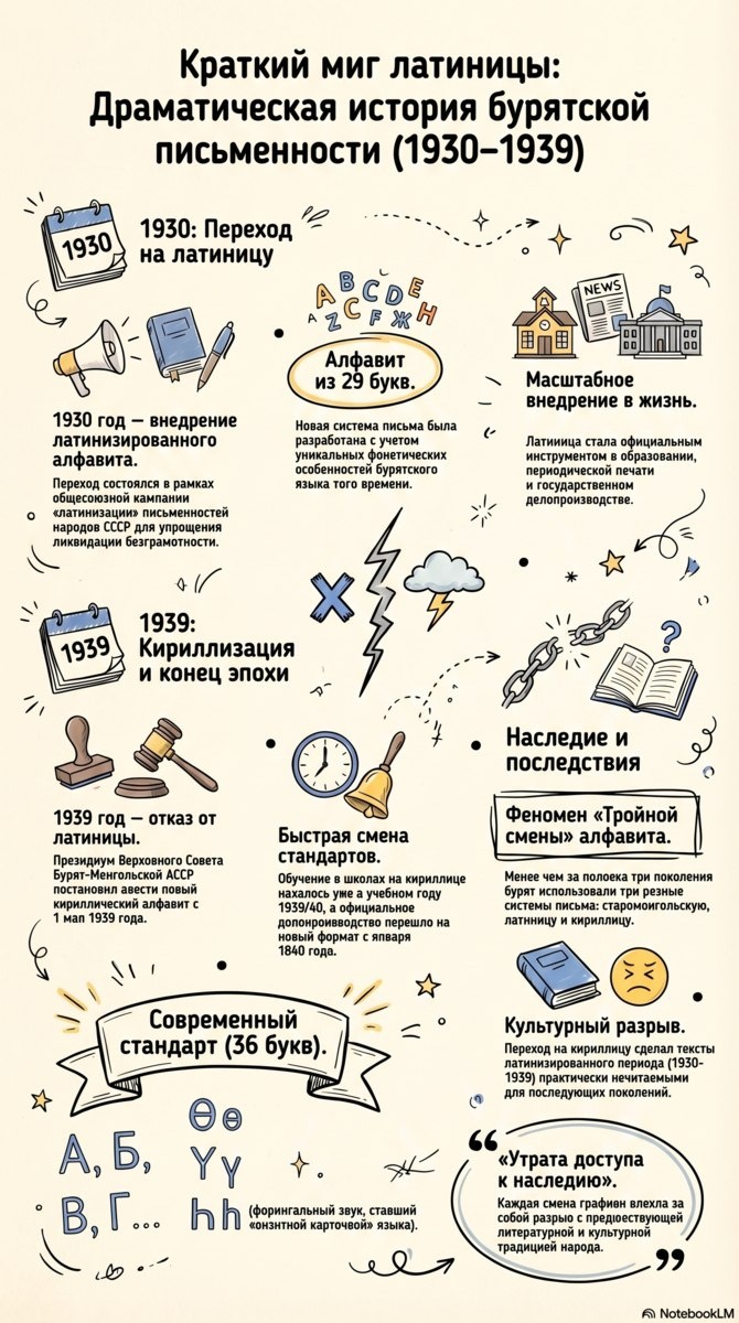 Менее чем за полвека буряты сменили три системы письма: старомонгольскую вертикальную, латиницу и кириллицу. Каждая смена отрезала следующие поколения от предыдущей литературы. В феврале 1930 года в Верхнеудинске утверждён латинизированный алфавит из 29 букв — в рамках общесоюзной кампании ликвидации безграмотности. Первый вариант ещё в 1905 году предложил учёный Б.Б. Барадин. С 1931 года латиница стала официальным языком образования, печати и делопроизводства. В 1939 году Президиум Верховного Совета Бурят-Монгольской АССР постановил перейти на кириллицу (с тремя дополнительными буквами: Ү, Ө, Һ) с 1 мая того же года. Итог — тексты 1930–1939 годов стали практически нечитаемыми для последующих поколений. Культурный разрыв не преодолён до сих пор. 📖 Источники: Wikipedia «Бурятская письменность»; диссертация Cheloveknauka.com «Латинизация бурят-монгольской письменности» (2020); ГТРК Бурятия