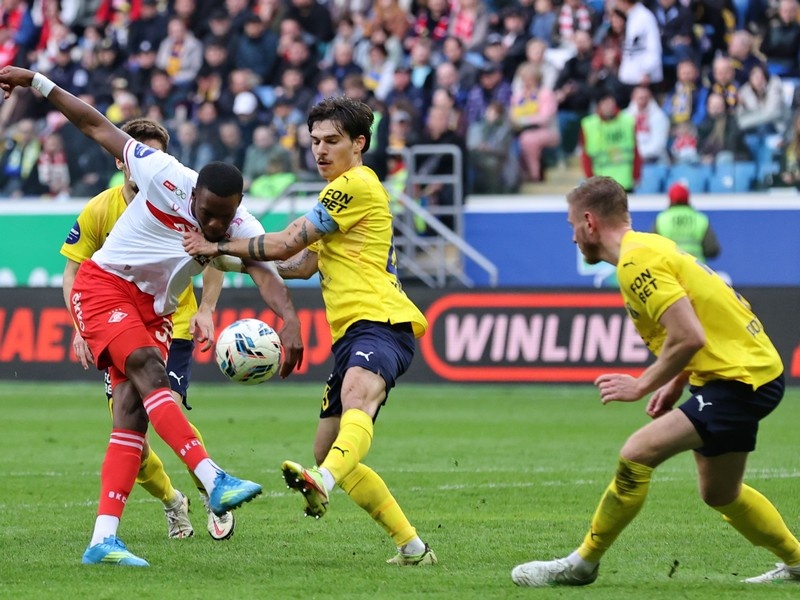 Мартинс решился на дальний удар. Мимо ворот. Нога опорная поехала в момент удара!
