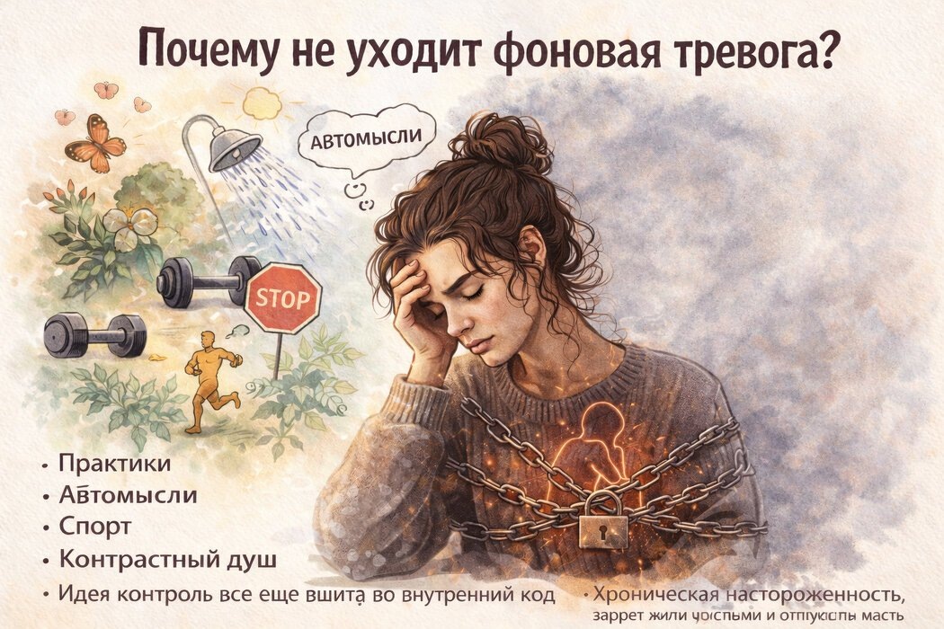 Очень многие думают, что если они убрали часть симптомов и научились оспаривать тревожные мысли, то дальше тревога должна просто сама уйти. Но фоновая тревога часто держится не только на мыслях. Она может держаться на гораздо более глубоком уровне - на общем тоне нервной системы, на способе жить, на привычке быть настороже, на внутреннем ощущении небезопасности, которое уже давно стало фоном.