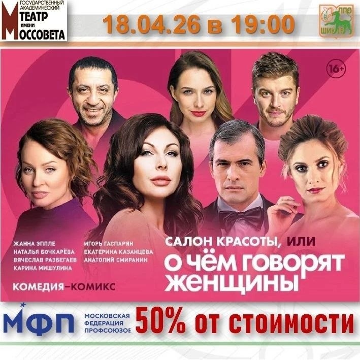 🔥 🏛ТУ МОССОВЕТ (Преображенская пл.,12) 🗓 18 апреля 19:00 Скидка 50% по промокоду: промокод спрашивайте у председателя ППО Билеты 🎫 https://ruteatr.ru/afisha/salon/ Вы когда-нибудь проводили расследование в салоне красоты? Нет? А доводили психолога до психоза? В салоне красоты «У Ван Гога» так проходит каждый день. Эвелина Блёданс расскажет вам, как варить лучший борщ, Наталья Бочкарева избавит вас от панических атак грудью, а Карина Мишулина объяснит, почему в ретроградный Меркурий лучше не ходить на свидания… В ролях: Наталья Бочкарёва,Жанна Эппле,Карина Мишулина, Екатерина Казанцева, Игорь Гаспарян, Анатолий Смиранин, Вячеслав Разбегаев