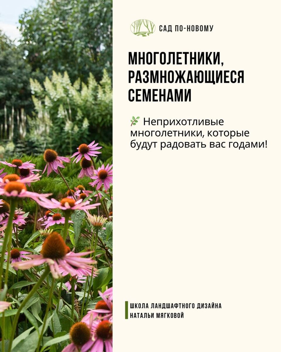 Коллекция неприхотливых и доступных многолетников, которые размножаются семенами: 1. Аквилегия гибридная — цветёт в мае-июне. Высота: 60-90 см. Цветки белые, розовые, синие, фиолетовые. В народе ее называют «водосбор» — капли дождя на листьях собираются в шарики. 2. Люпин гибридный — цветёт в июне-июле. Высота 80-120 см. Удивительно неприхотлив: любит бедные почвы и радует палитрой от чисто-белого до глубокого фиолетового. 3. Наперстянка пурпурная — цветёт в июне-июле. Высота до 150 см. Цветки розовые, белые, пурпурные. В старину верили, что в её цветах живут гномы! 4. Лихнис корончатый — цветёт в июне-июле. Высота 40-60 см. Цветки белые, розовые, пурпурные. Стойко переносит морозы без укрытия, морозоустойчив. 5. Шалфей дубравный — цветёт с июня по август. Высота 30-60 см. Цветки лилово-фиолетовые. Его листья активно используют в кулинарии как пряность. 6. Гелениум осенний — цветёт с августа по октябрь. Высота 90-130 см. Цветки жёлтые, оранжевые, красно-коричневые. Продолжает цвести, к