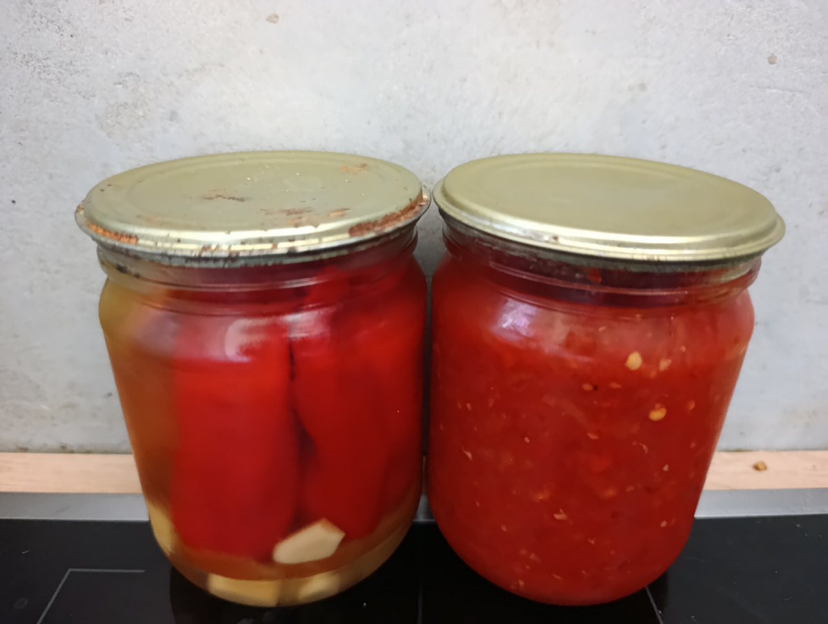 И та-дам, имеется у меня в холодильнике перекрученные помидоры перцем болгарским 1 к 1 и добавками острого перца и чеснока (это одна из не многих моих летних заготовок).