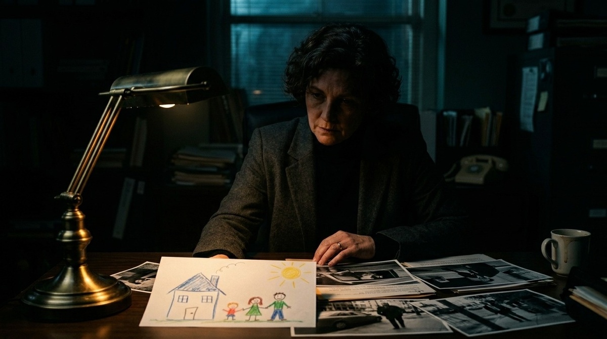 Я нашла его в середине пачки. Объектив поймал хорошо, фокус лёг на лист. Домик с треугольной крышей, жёлтое солнце в углу, три фигурки разного роста – большая, средняя, маленькая. Карандаши. Детский рисунок, всё как полагается.