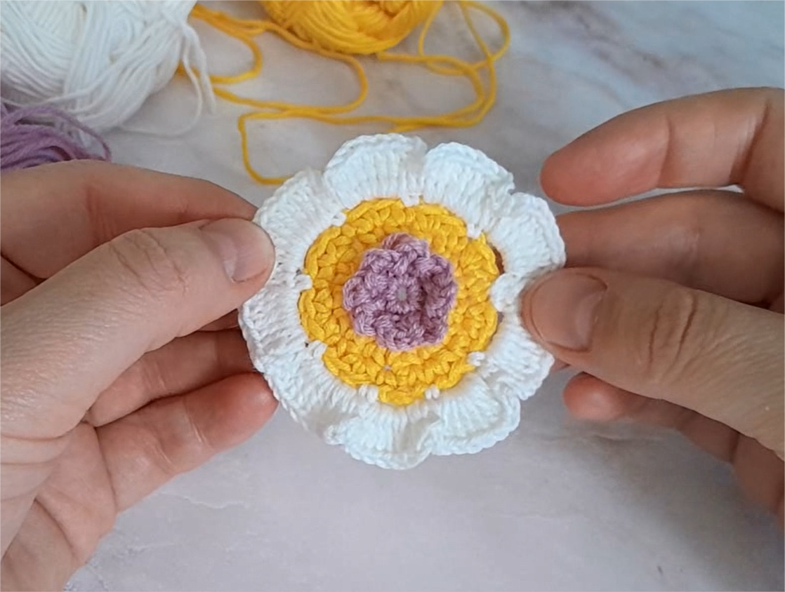 Я всех рада приветствовать на своем канале. Спасибо, что нашли время и заглянули. Вы на канале "Вяжу опять и снова. Вязаномания" Хочется немного забежать вперёд и немного похвастаться: сумка из джинсовой ткани с вязаными аппликациями у меня готова. Но перед тем как я её вам покажу, мы разберем, как связать две оставшиеся цветочные аппликации. Сегодня на очереди трехцветный винтажный цветок. Цветок вяжется по кругу. Для вязания цветка я выбрала три разных цвета: желтый, розовый и белый. Вы же можете выбрать те цвета, которые вам больше нравятся. Для вас ниже размещаю подробное описания вязания ряд за рядом. Условные сокращенные обозначения: в.п.- воздушная петля сбн - столбик без накида ссн - столбик с накидом cc - соединительный столбик 1 ряд. Вяжется нитью розового цвета. В петлю амигуруми связать 8 сбн. 2 ряд. *1 сбн, 3 в.п. * Повторять от* и до* до конца ряда. Всестолбики без накида вяжутся за переднюю полупетлю. 3 ряд. Цвет нити поменять на жёлтый. В каждую петлю вязать по 2 ссн.
