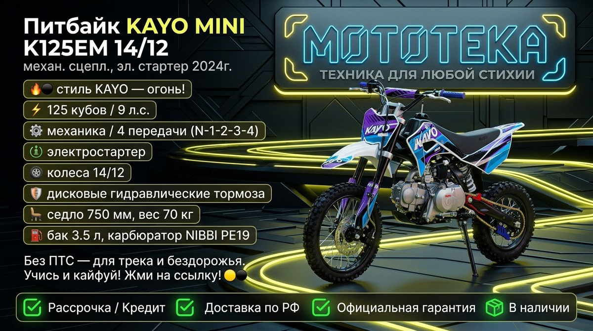 Коллеги, технические данные по питбайку KAYO MINI K125EM (14/12, 2024 г.). 🔹 Двигатель: OEM KAYO, 125 см³, 4-тактный, 1 цилиндр, мощность 9 л.с., воздушное охлаждение. 🔹 Питание: Карбюратор NIBBI PE19. 🔹 Трансмиссия: Механическая, 4 передачи (N-1-2-3-4). 🔹 Стартер: Электро. 🔹 Колеса: 14/12 дюймов. 🔹 Тормоза: Дисковые гидравлические (перед/зад). 🔹 Подвеска: Передняя — телескопическая 625 мм, задняя — моноамортизатор 280 мм (оба нерегулируемые). 🔹 Колесная база: 1125 мм, высота седла 750 мм. 🔹 Бак: 3.5 л. 🔹 Вес: 70 кг. 🔹 Габариты: 1540×750×1010 мм. 🔹 Освещение: Отсутствует. 🔹 Документы: Без ПТС. Ключевая особенность — компактные размеры, электростартер и карбюратор NIBBI PE19. Ссылка на товар: https://clck.ru/3T4ZRw #KAYO #MINIK125EM #Питбайк #Техника #МотоТека #Спецификация