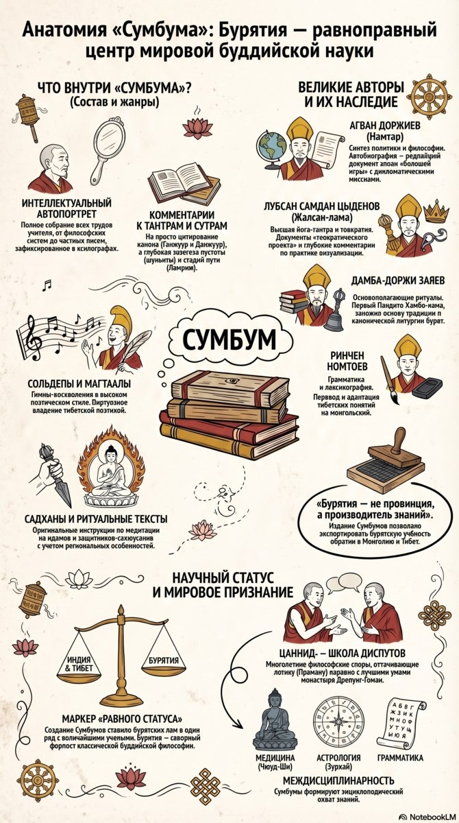 Но для Бурятии это не просто литературный жанр — это свидетельство равноправия с тибетской и индийской учёностью. Один из ключевых авторов — Агван Доржиев (1853–1938): наставник Далай-ламы XIII, дипломат при дворе Николая II и основатель первого буддийского храма в Европе — петербургского дацана Гунзэчойнэй. Его автобиография, написанная в стихах на монгольском языке в 1921 году, хранится в Институте восточных рукописей РАН. Издание Сумбумов позволило бурятским учёным экспортировать знания обратно в Монголию и Тибет — туда, откуда традиция пришла. Бурятия стала не провинцией, а производителем буддийской науки. 📖 Источники: Андреев А.И. «Агван Доржиев и судьбы буддийской религии в СССР»; Ангаева С.П. «Буддизм в Бурятии и Агван Доржиев» (Улан-Удэ, 1999)
