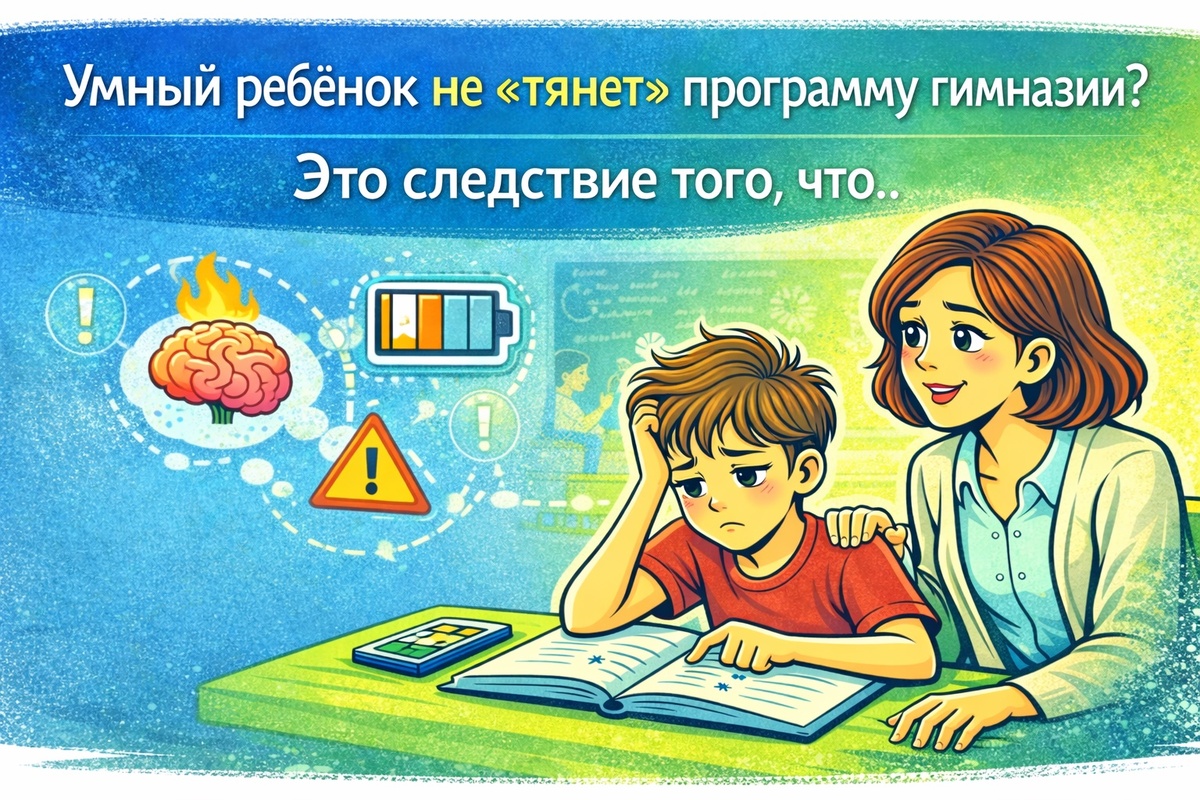 Когда ребёнок не справляется с гимназией — проблема не в том, что он не знает тему. Проблема в том, что его мозг пока не успевает за темпом, не удерживает объём, устаёт раньше, чем заканчивается урок. И репетитор по математике эту проблему не видит. Он объясняет дроби — и дроби ребёнок понимает. Но завтра на уроке физики случится то же самое, что было вчера на математике.